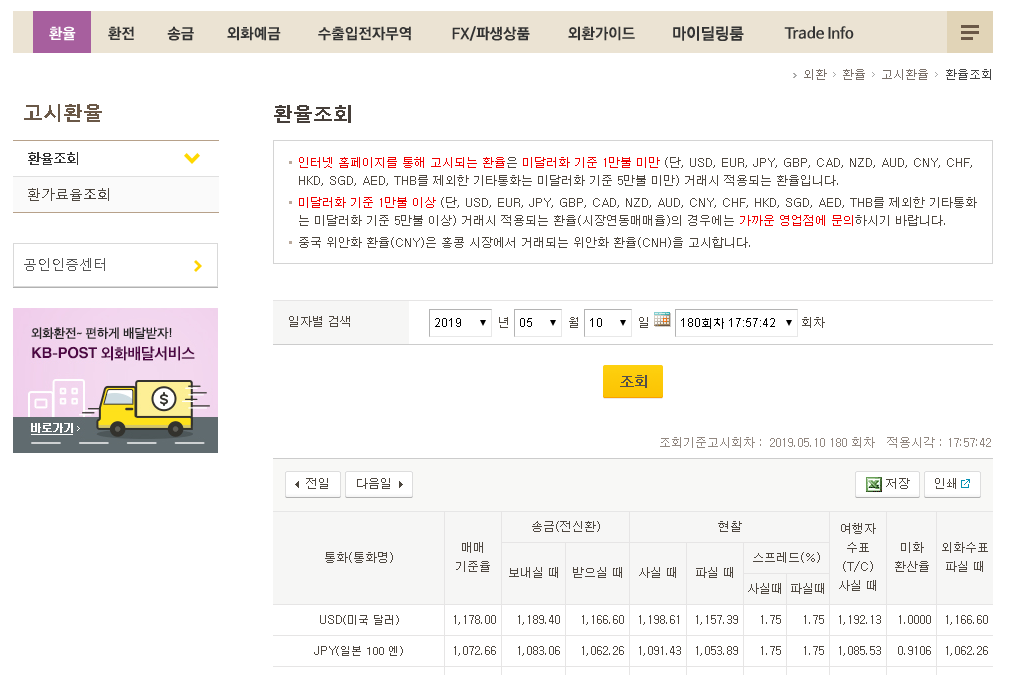 선택하신 조회일이 휴일인 경우 전 영업일자로 조회되며 일자선택 시 1986127 부터 조회 가능합니다. 환전 시 우대 쿠폰으로 환율우대 90 서비스 혜택은 국민은행 리브 Liiv 앱을 통해 환전할 경우 주요 통화 USD JPY EUR 90 환전우대를 적용받을 수 있습니다. 서비스 KB환전서비스 최대 90까지 환율우대 받고 인터넷으로 편하게 환전 하세요.