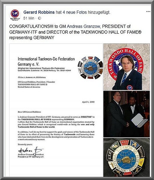 7th dan Promoted in DPRK 1994-1998 Director for hosinsul country BW Germany landesverband Baden wurttemberg eV. Master Gerald Robbins Präsident der Taekwondo Hall of Fame folgte dem Ehrungsvorschlag von Master Andreas Granzow und lud Sabum Hans-Gerd Hinz 6. 49 7423 86384-21 andreasjehlegranzowde Adresse.