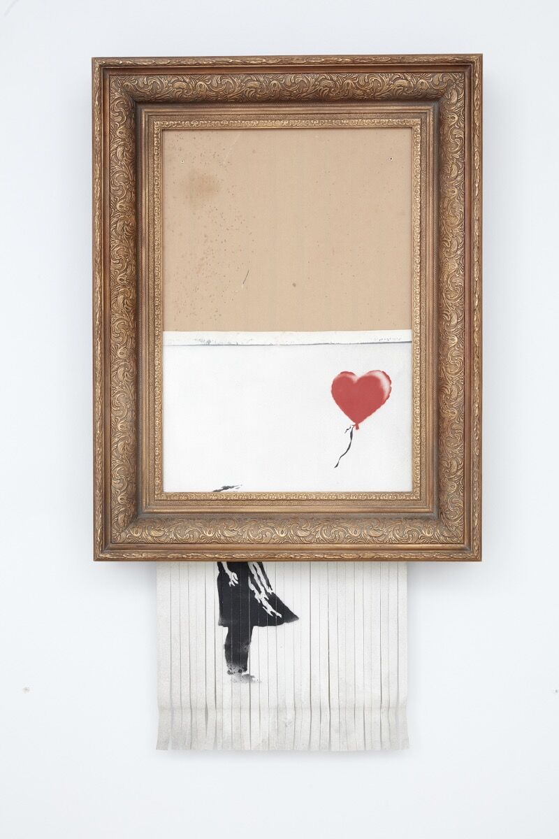 A partially shredded canvas of one. The resulting artwork was later renamed Love Is in the Bin. Banksy shocked everyone when his piece Girl With Balloon started self-destructing just after being sold for 1042000 at an auction at Sothebys.